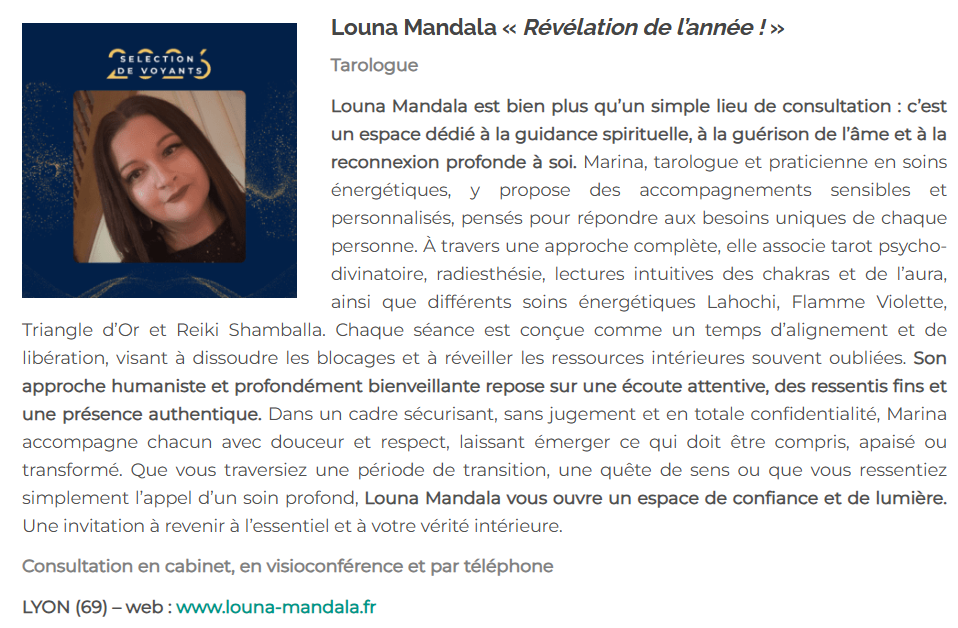 Je suis honorée et profondément heureuse de t'annoncer que Louna Mandala fait partie de la sélection 2026 du Guide de la Voyance.